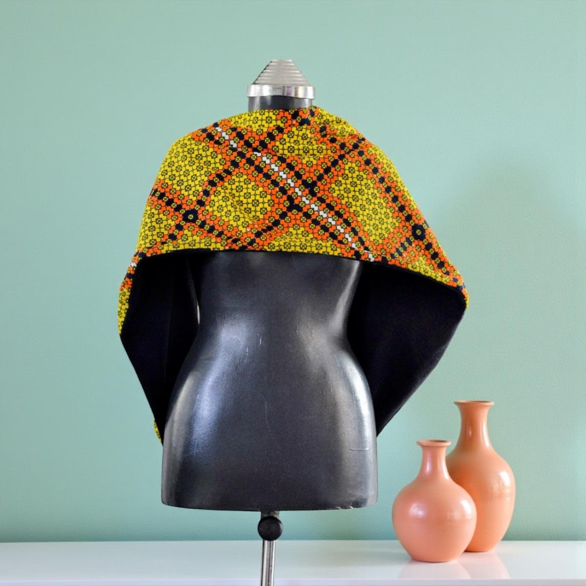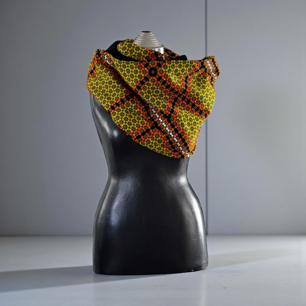 Le tour de cou est drapé de manière à ce que les deux faces soient visibles, créant un contraste saisissant entre le motif dynamique et la sobriété du noir. Il donne une impression de chaleur et de style ethnique chic.