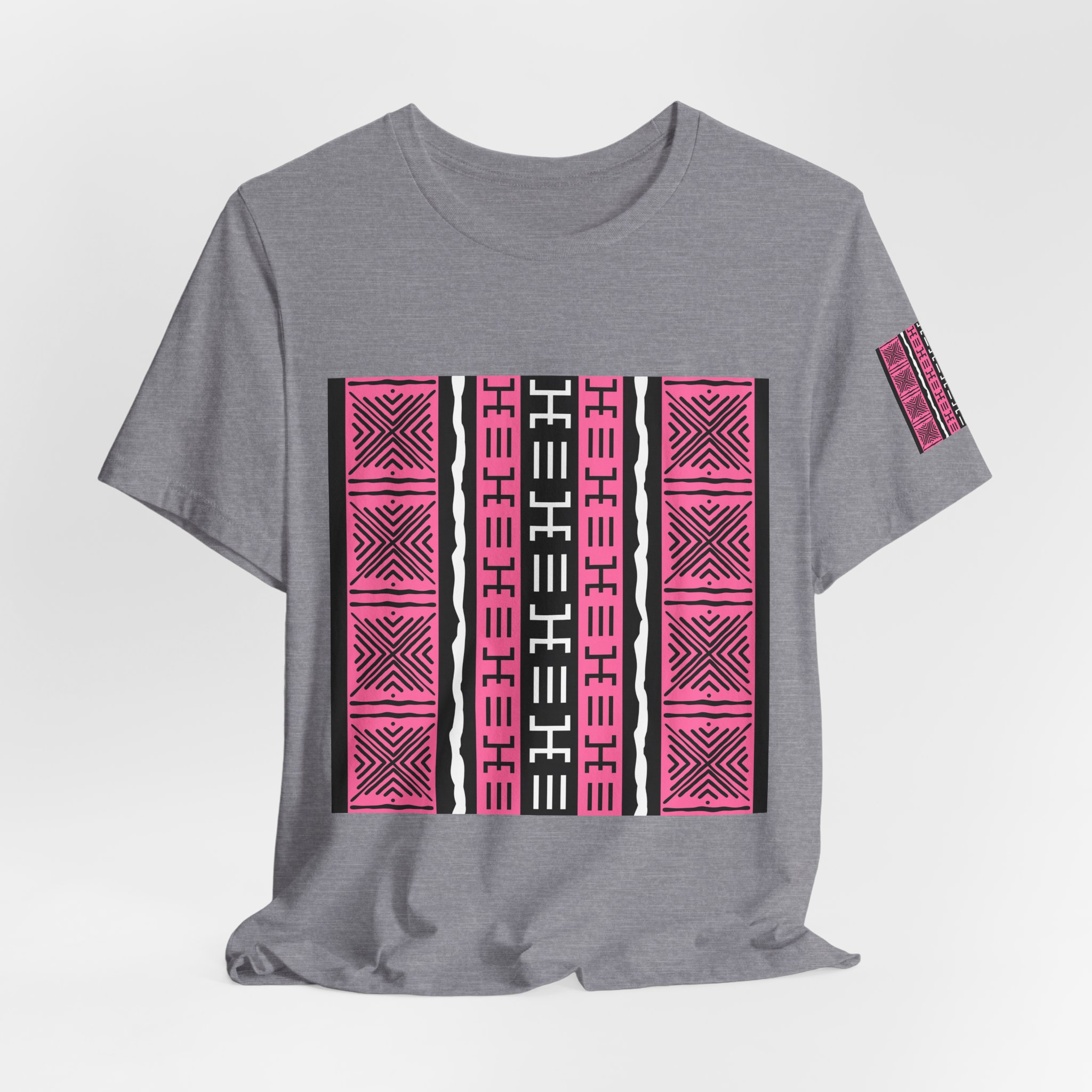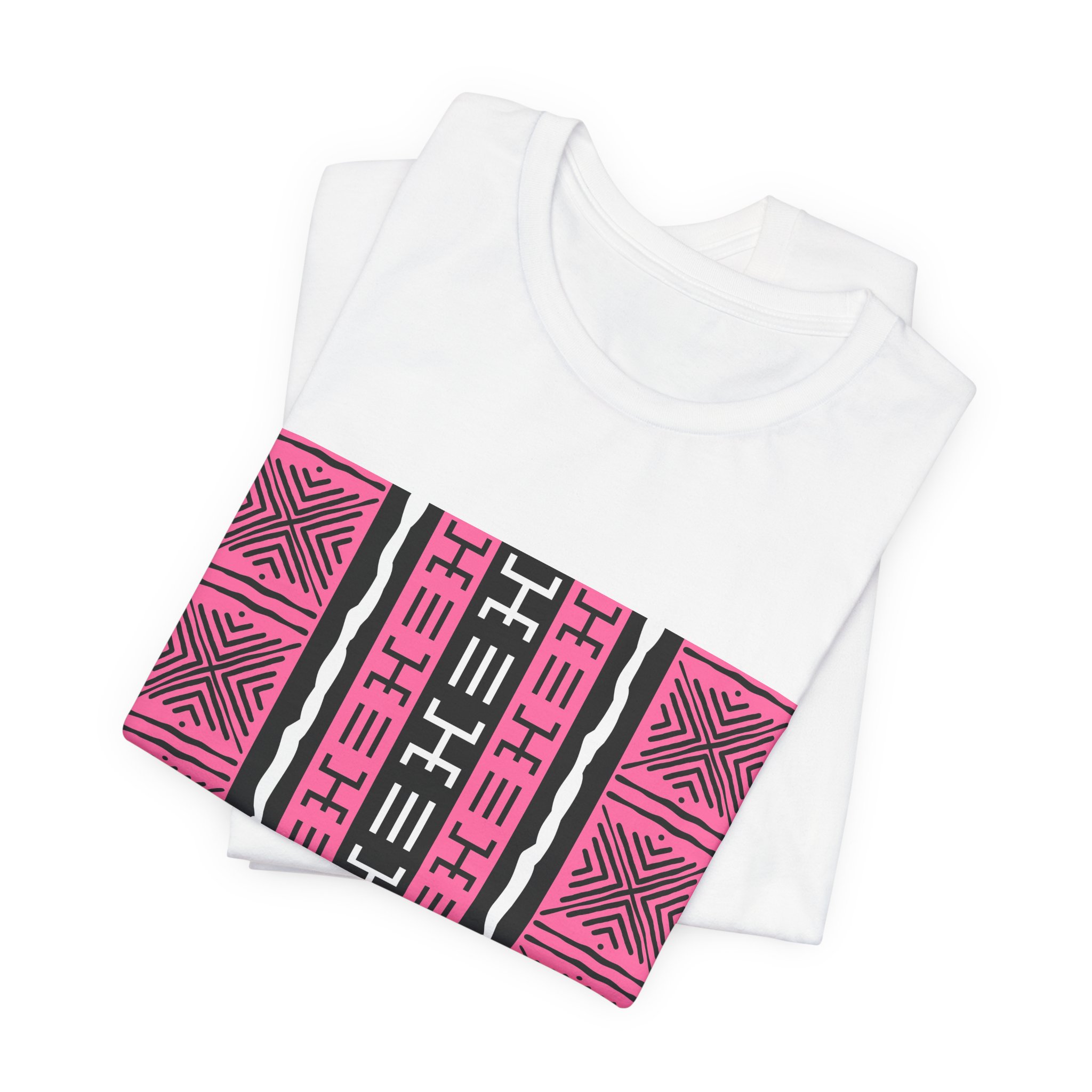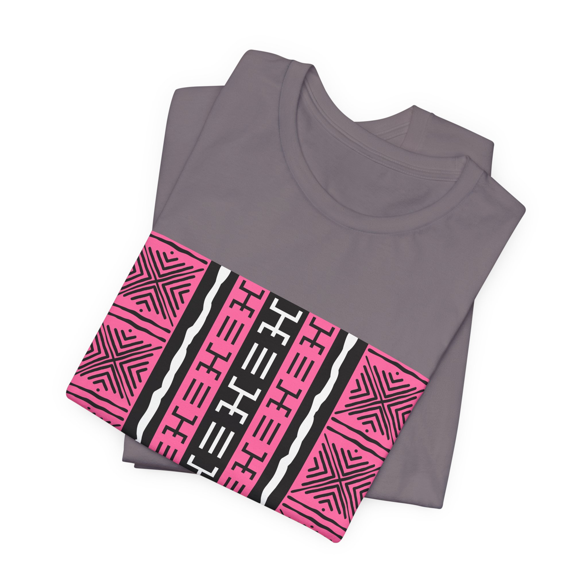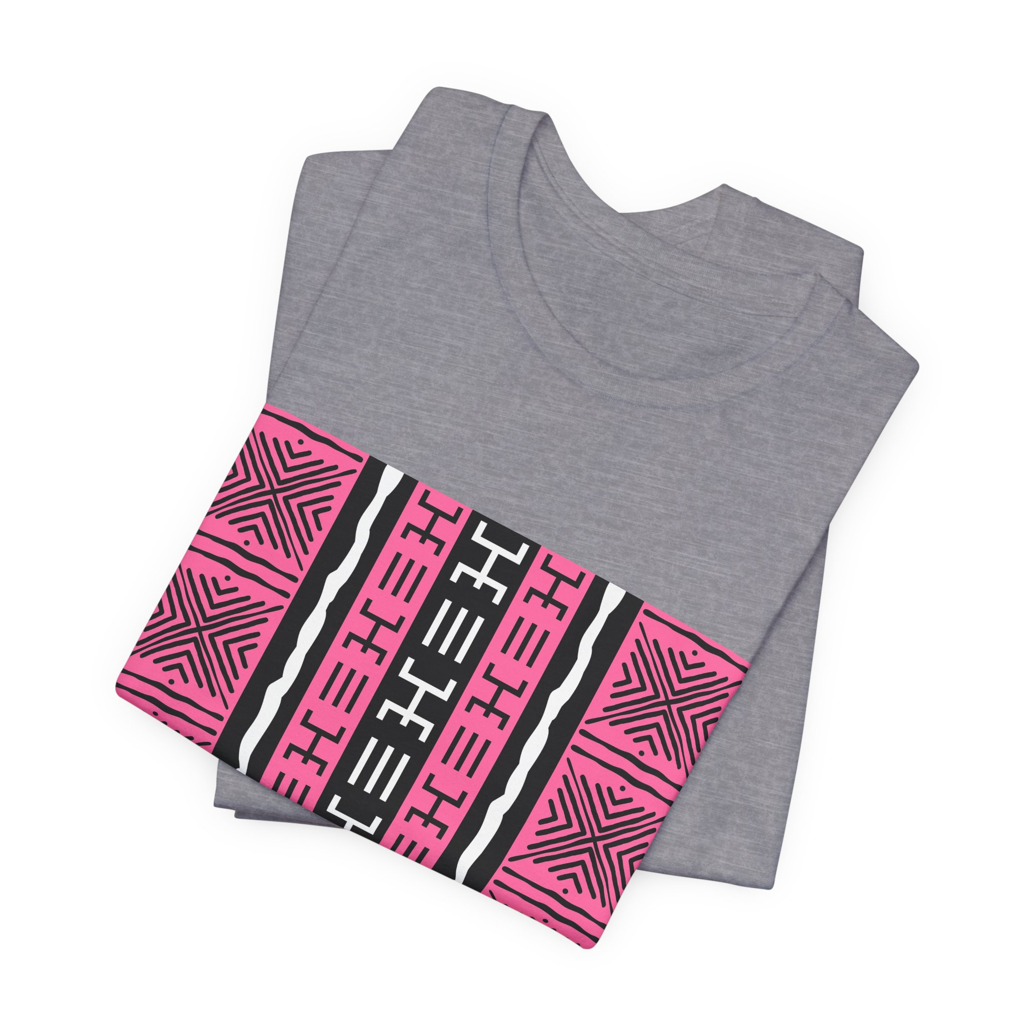 Ce t-shirt léger et respirant imprimé tribal géométrique centré rose et noir