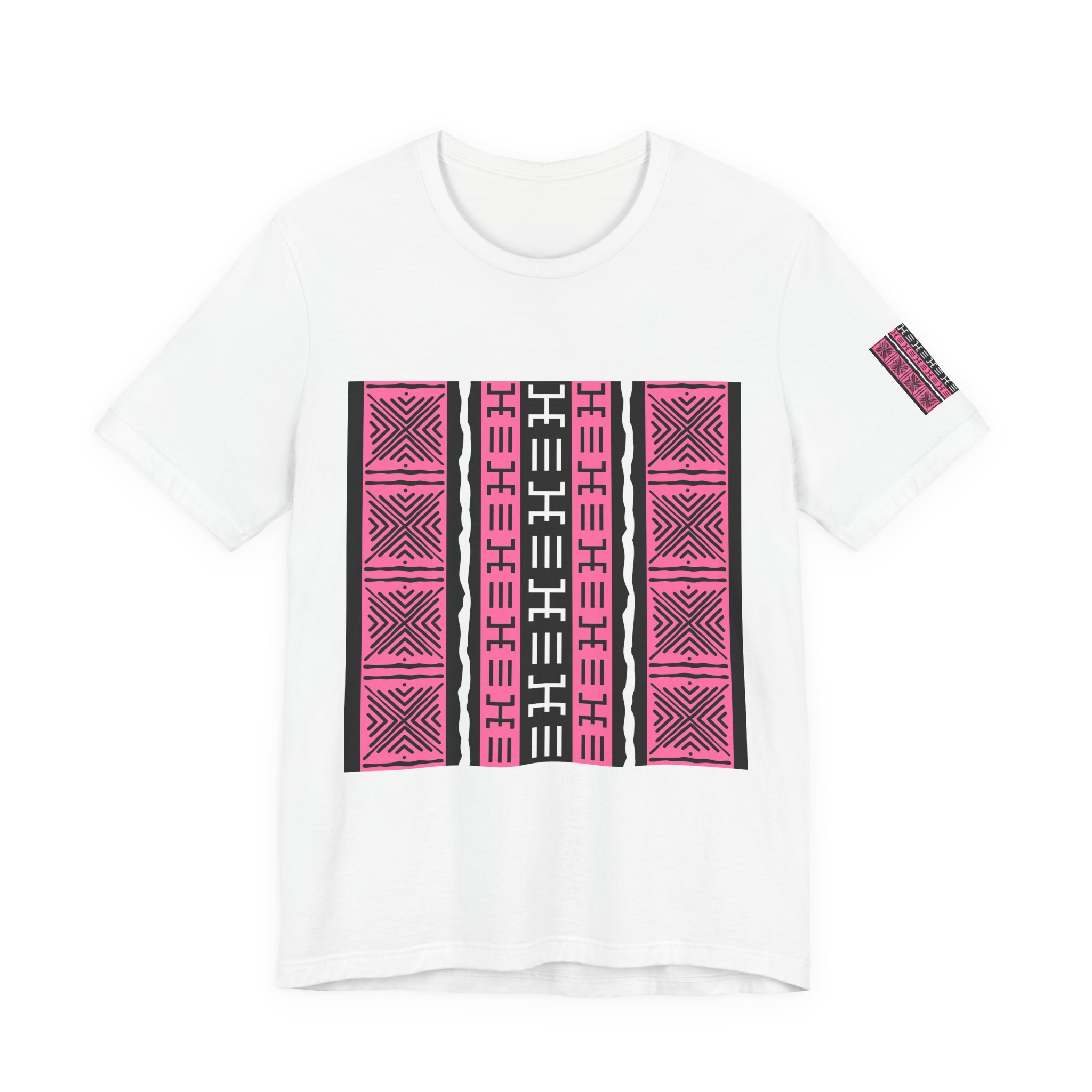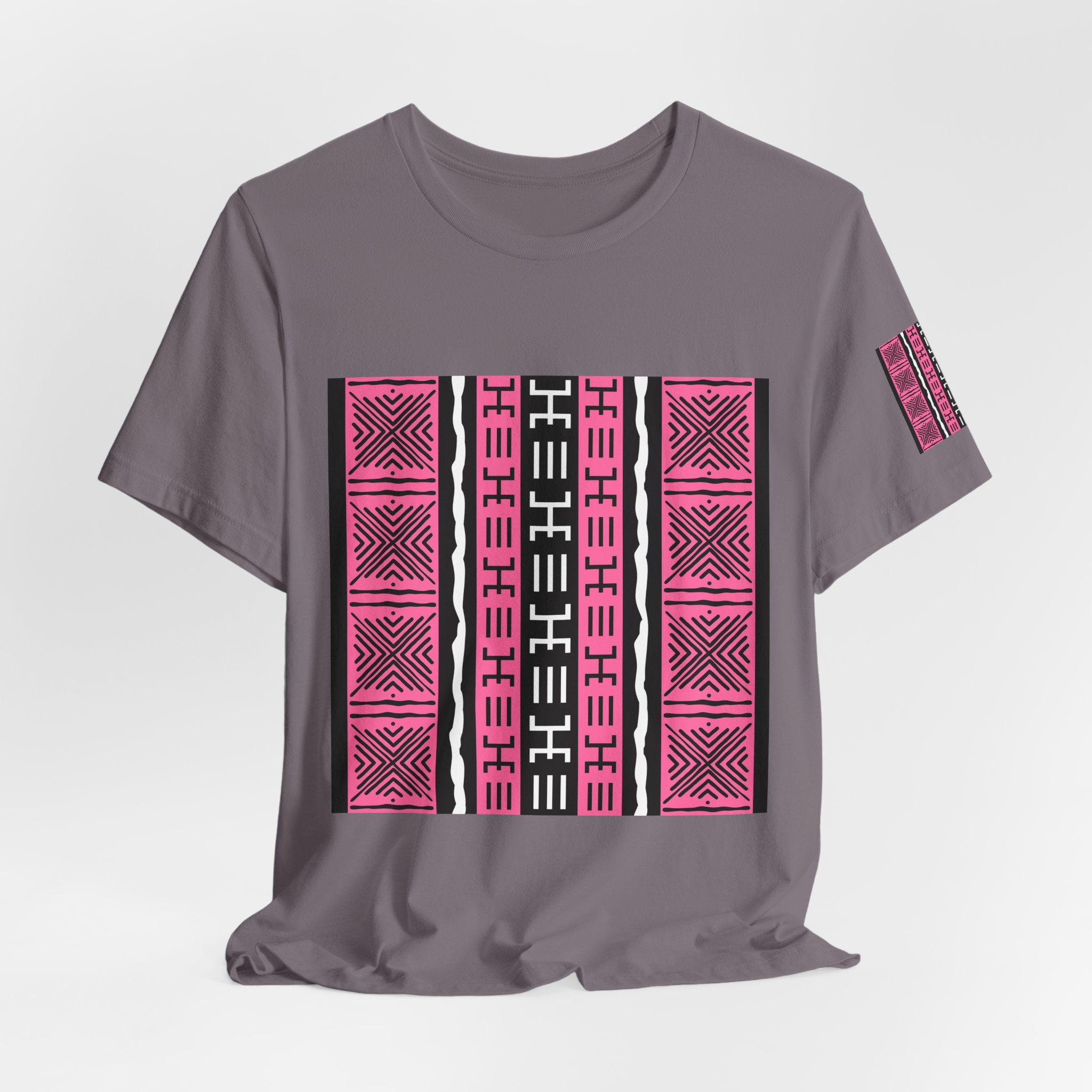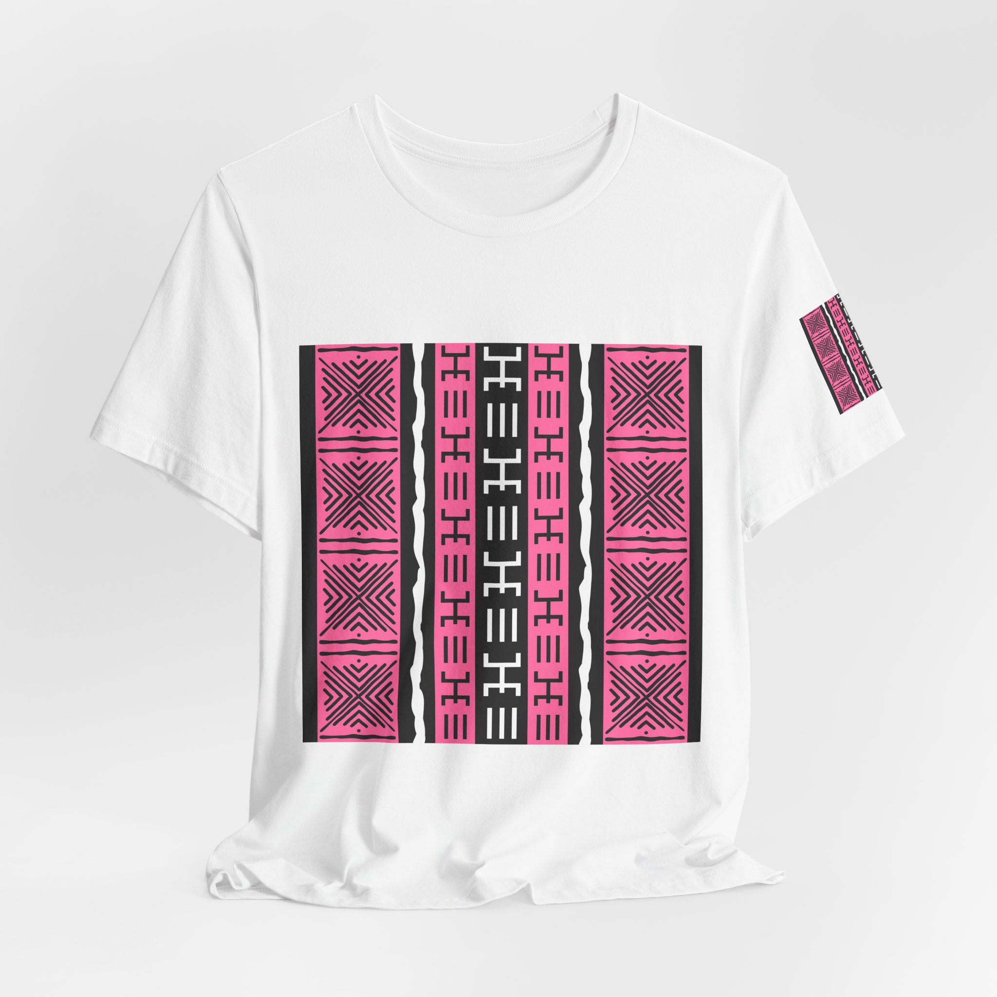 Ce t-shirt léger et respirant imprimé tribal géométrique centré rose et noir