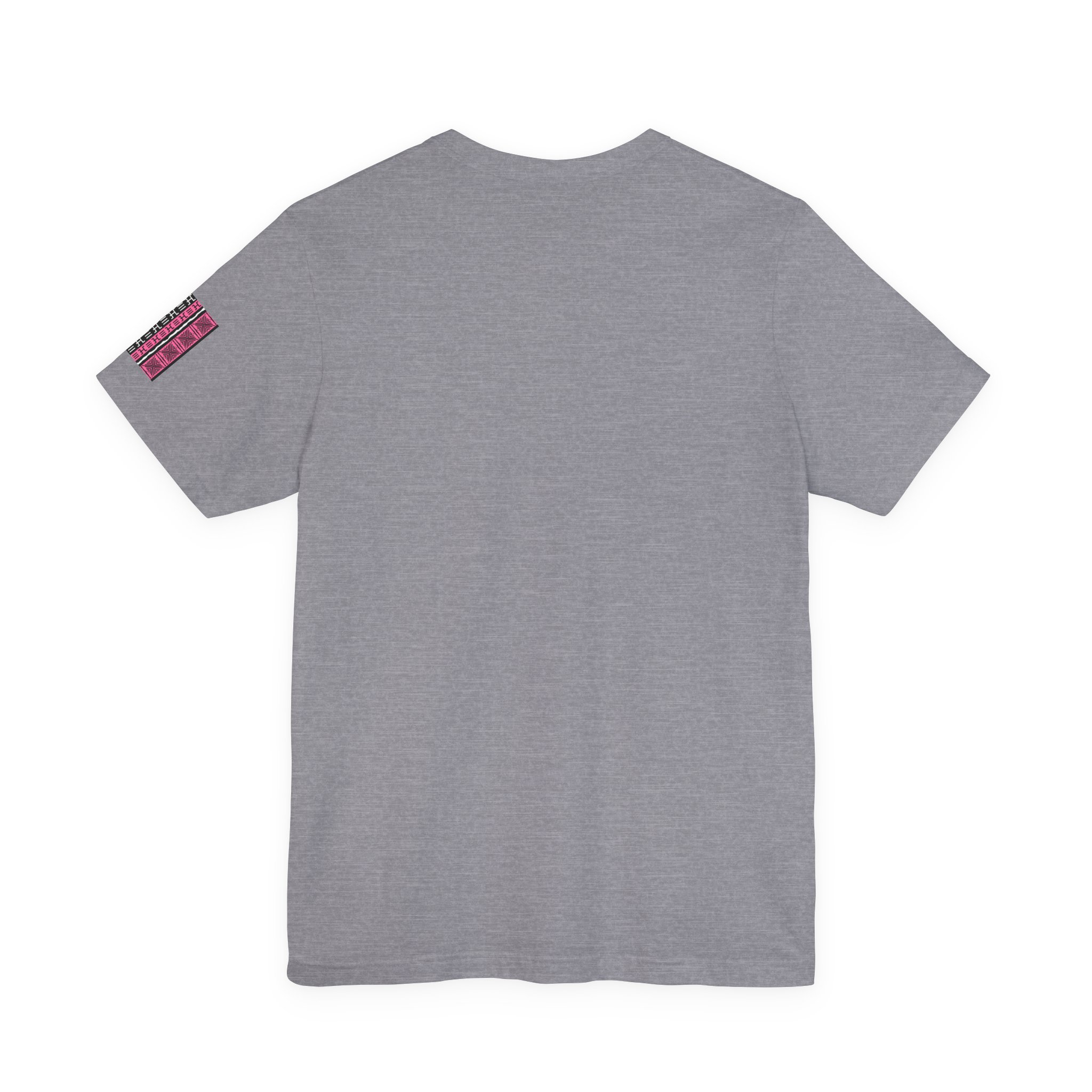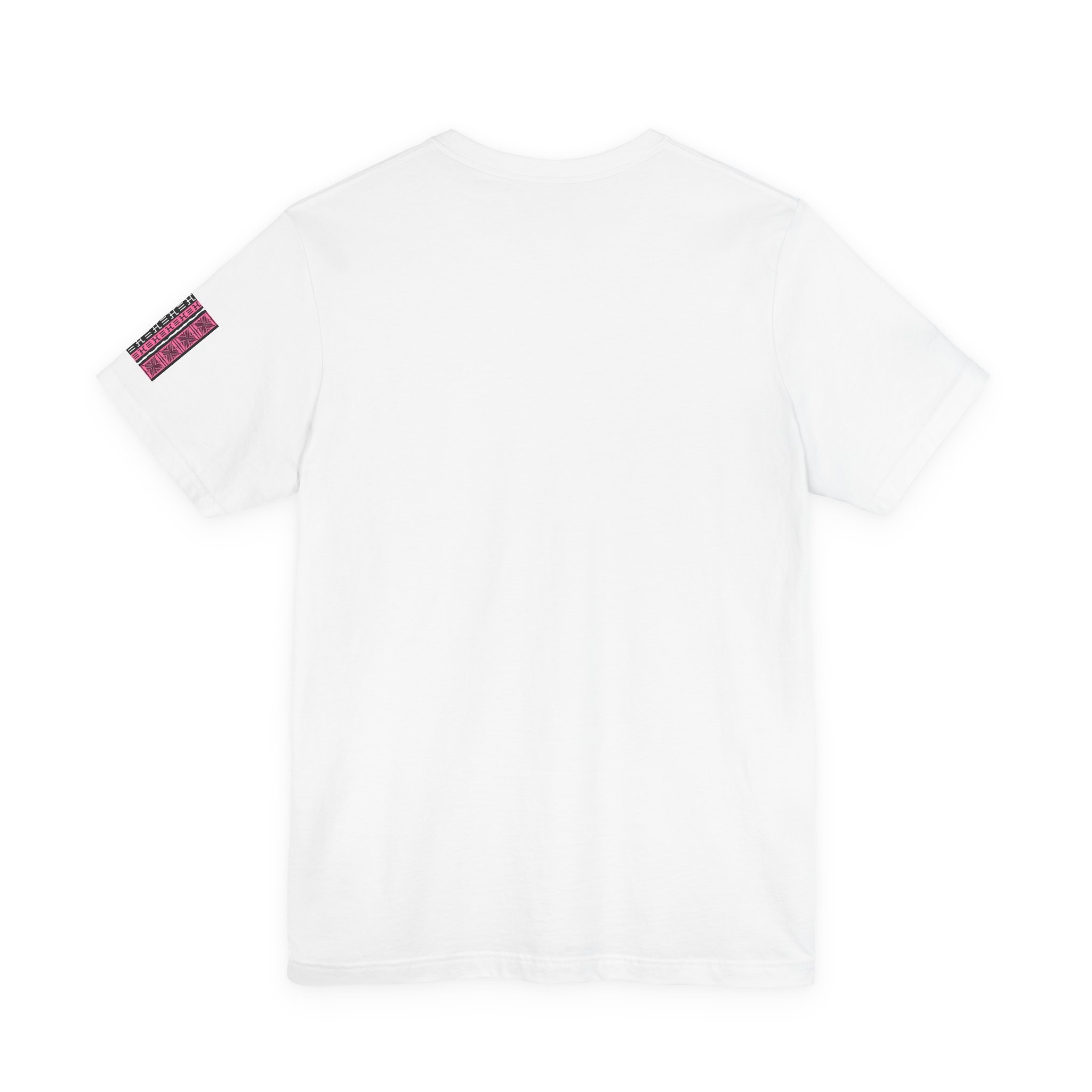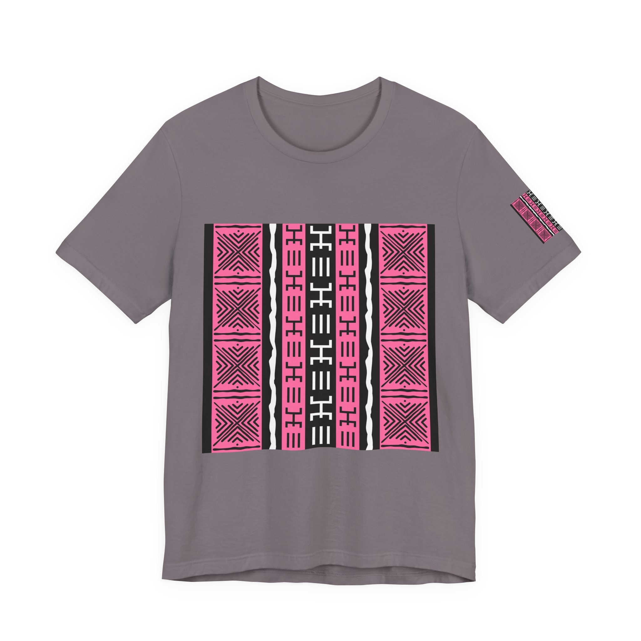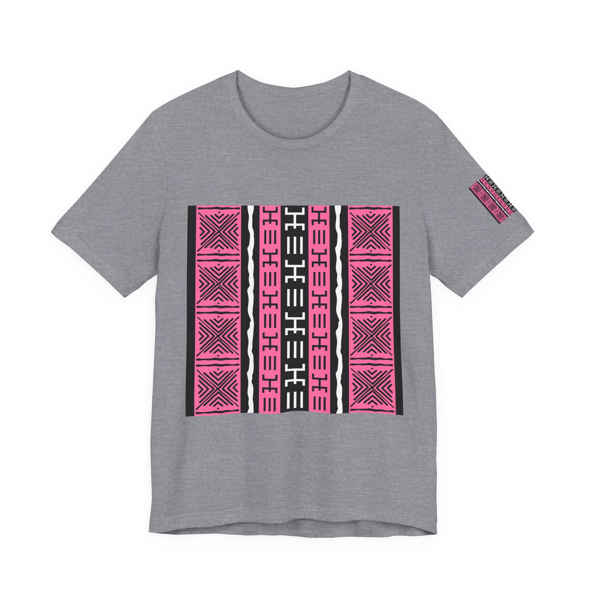 Ce t-shirt léger et respirant imprimé tribal géométrique centré rose et noir